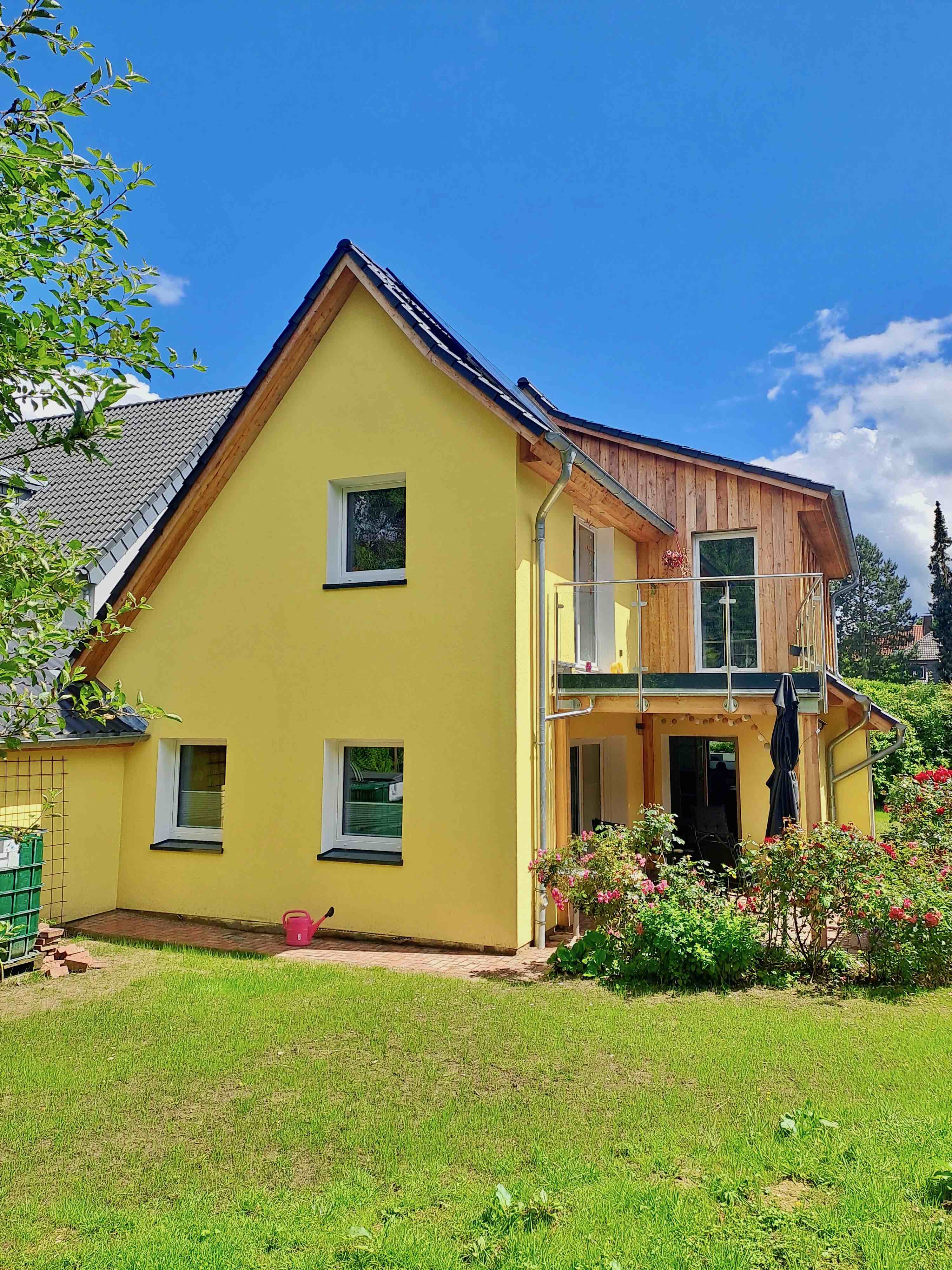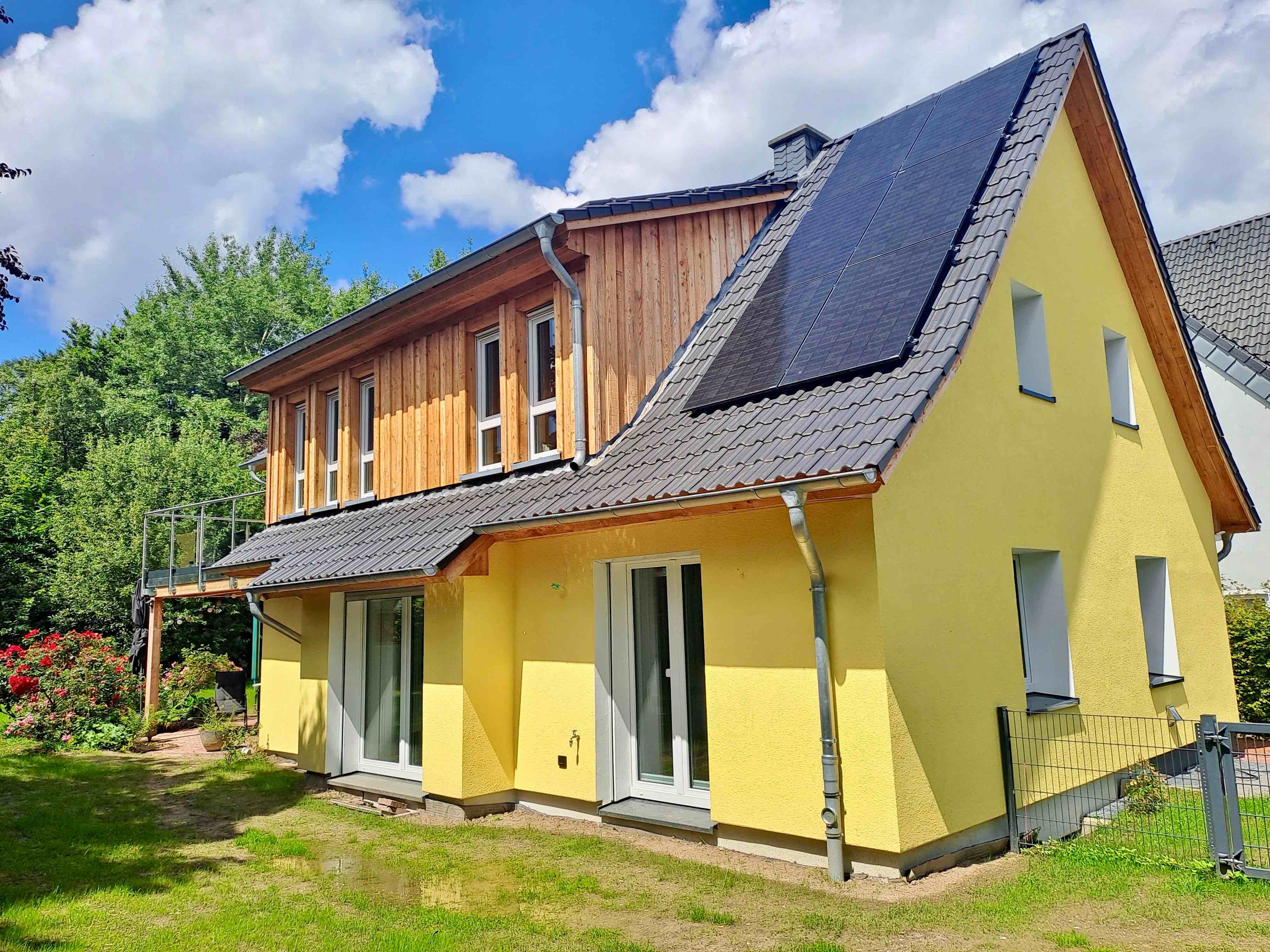 Erweiterung Gaube, Ersatz des Stahlbetonbalkons durch Holzbalkon und energetischer Sanierung: Außendämmung mit WDVS aus 200 mm Holzweichfaserplatten, mineralischem Putz und Anstrich mit einer Silikatfarbe, Erneuerung der Fenster und Austausch der Gasheizung mit einer Wärmepumpe und Installation von Photovoltaikanlage.