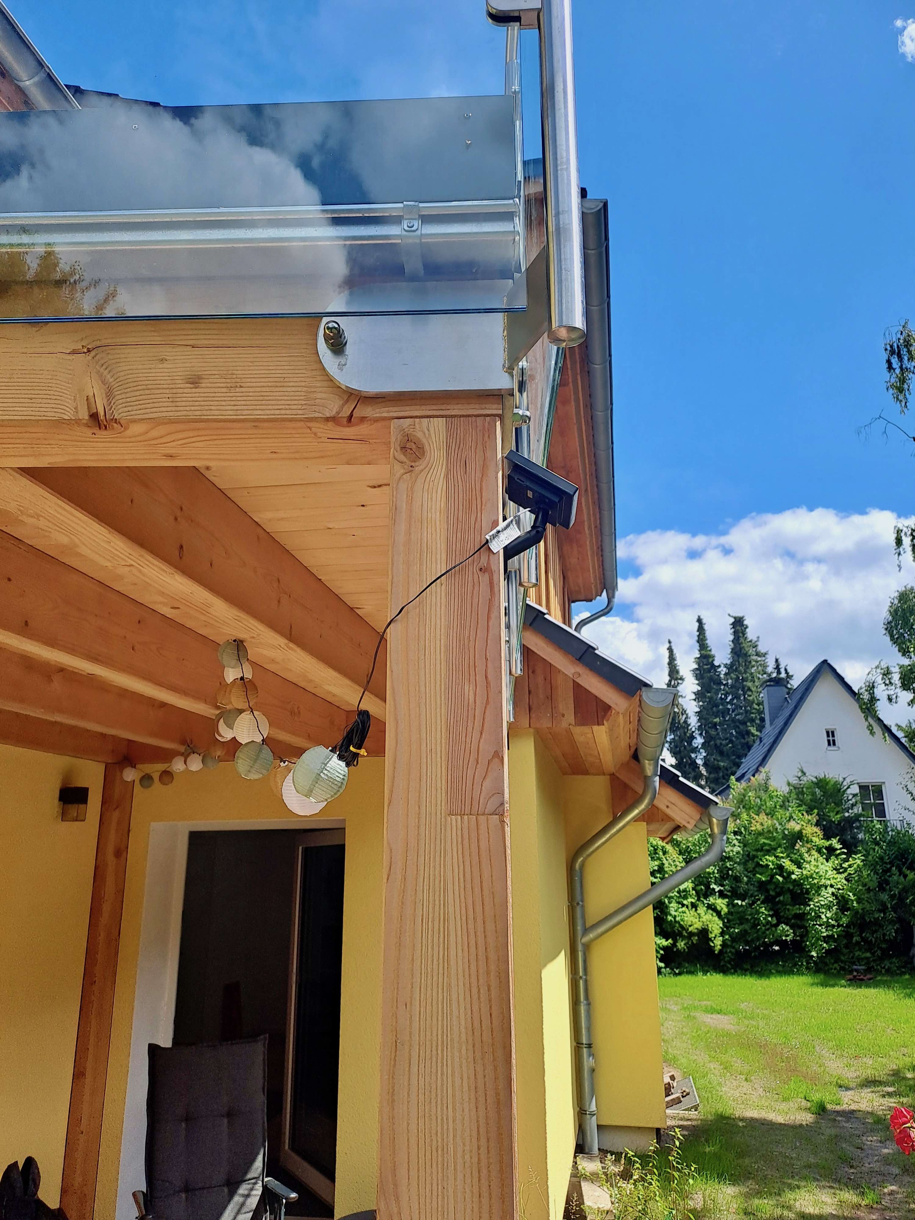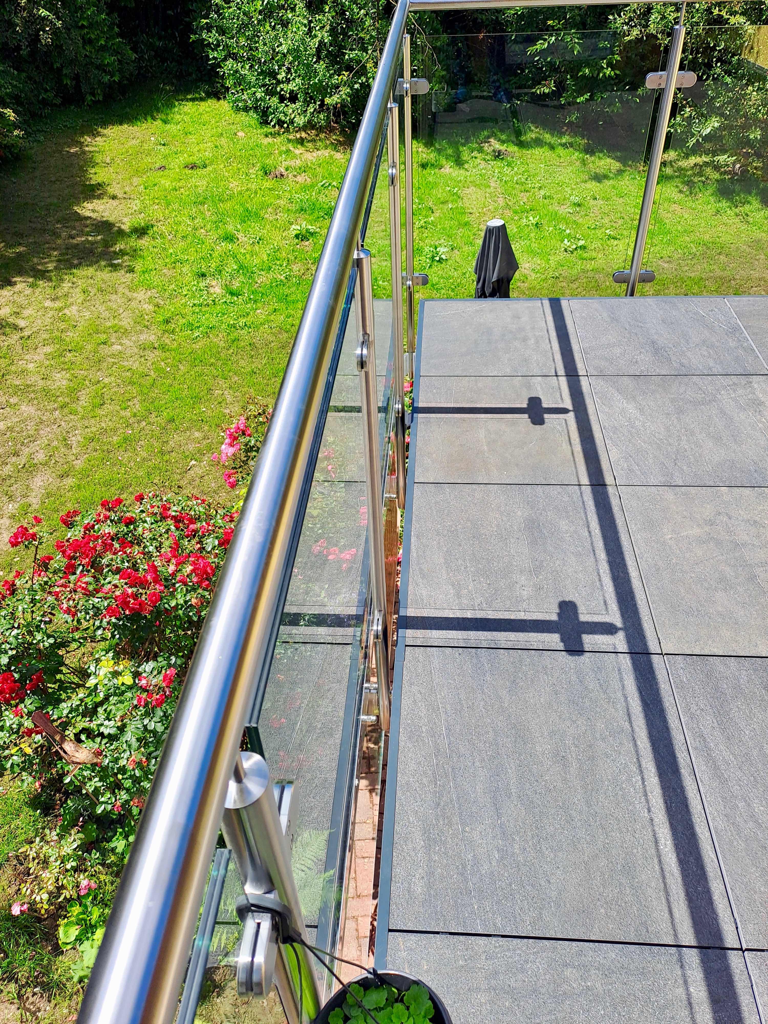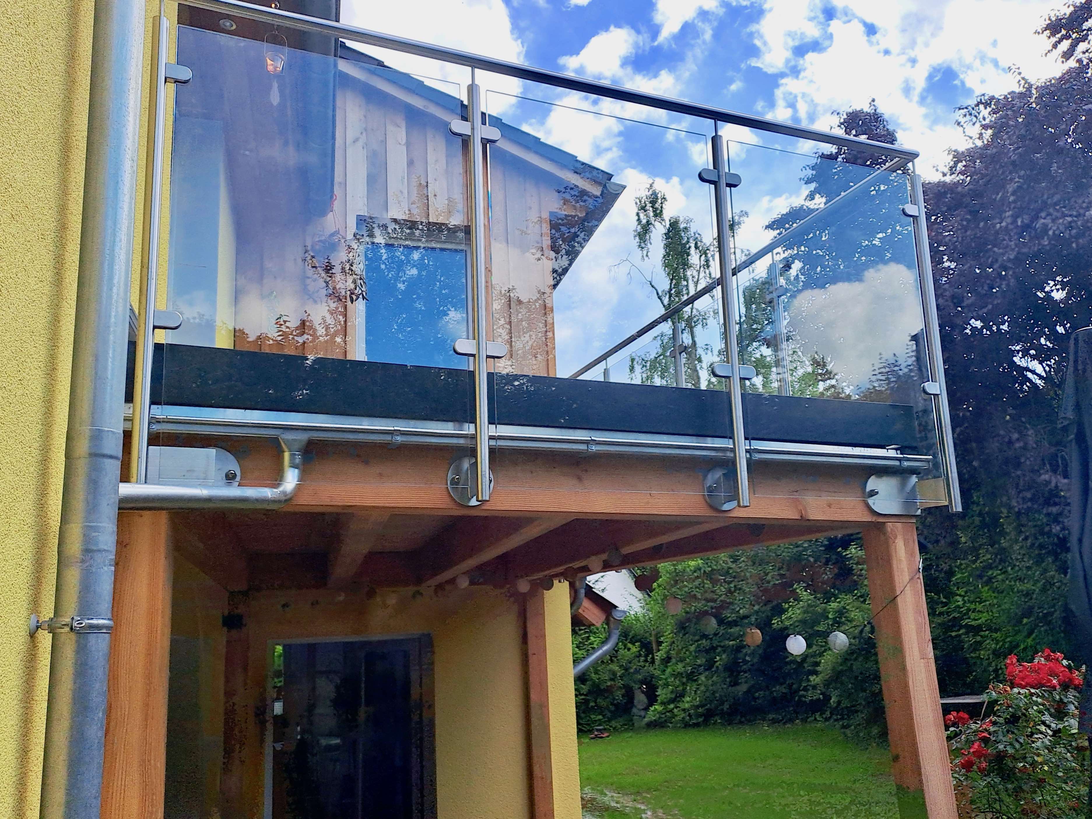 Balkon aus Lärchenholz mit Brüstungsgeländer aus Edelstahl und Glas