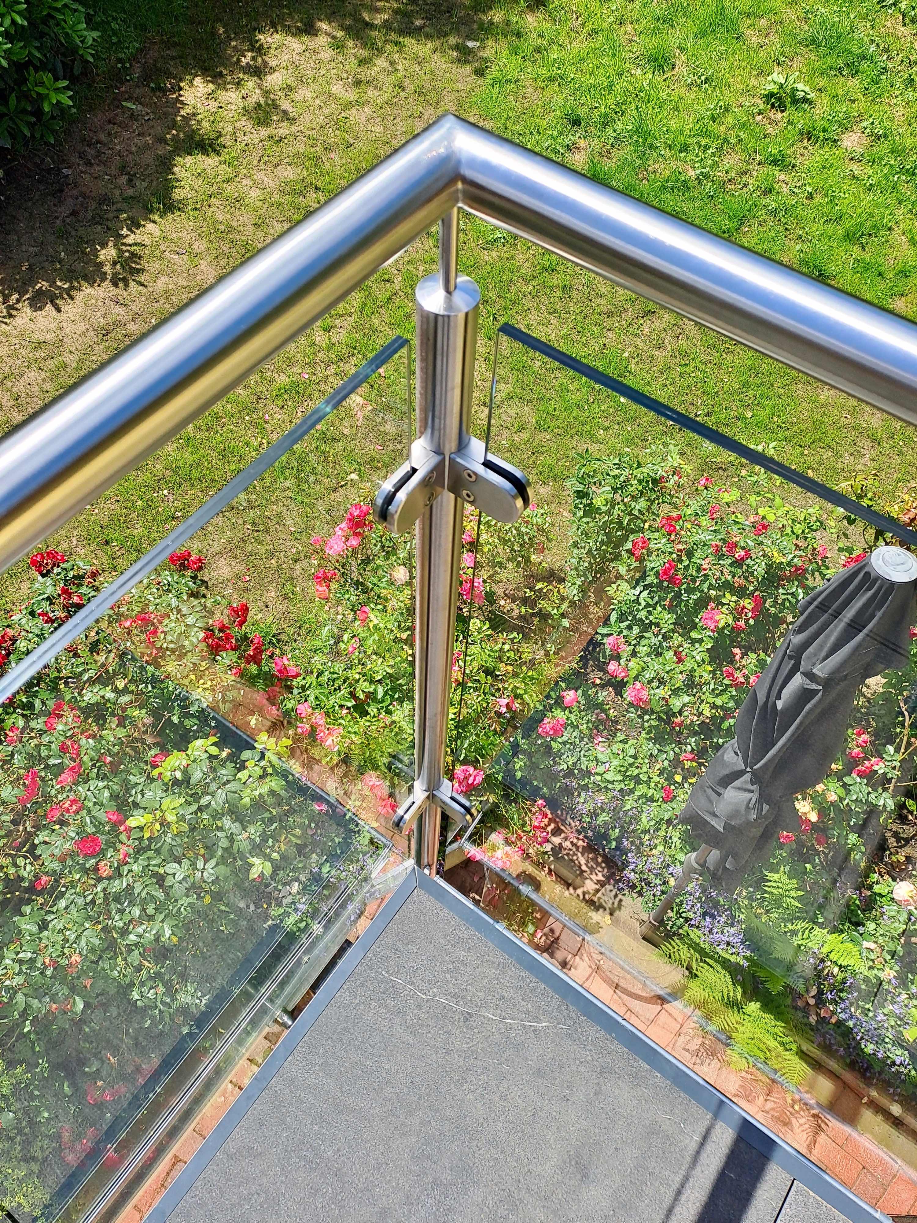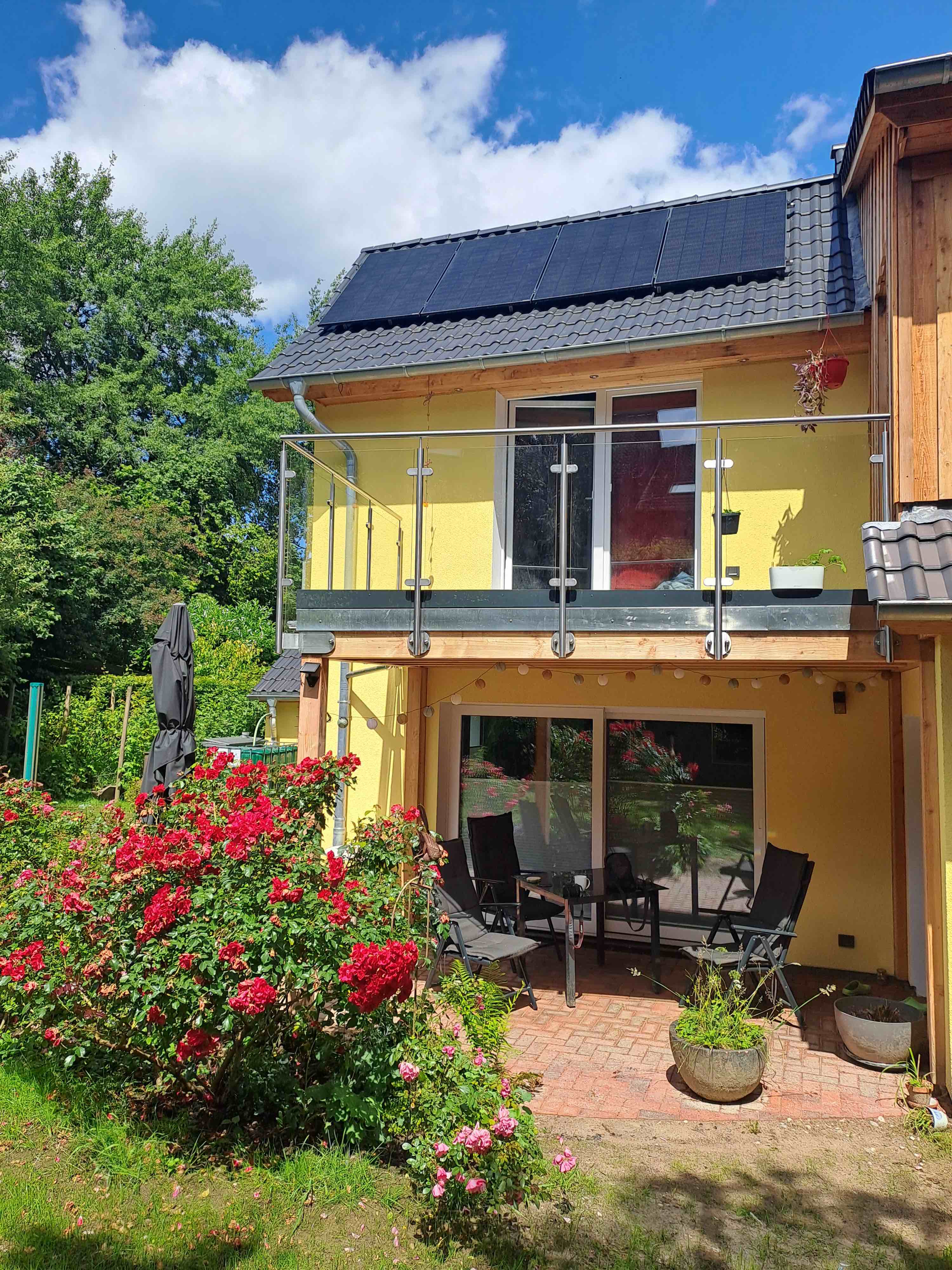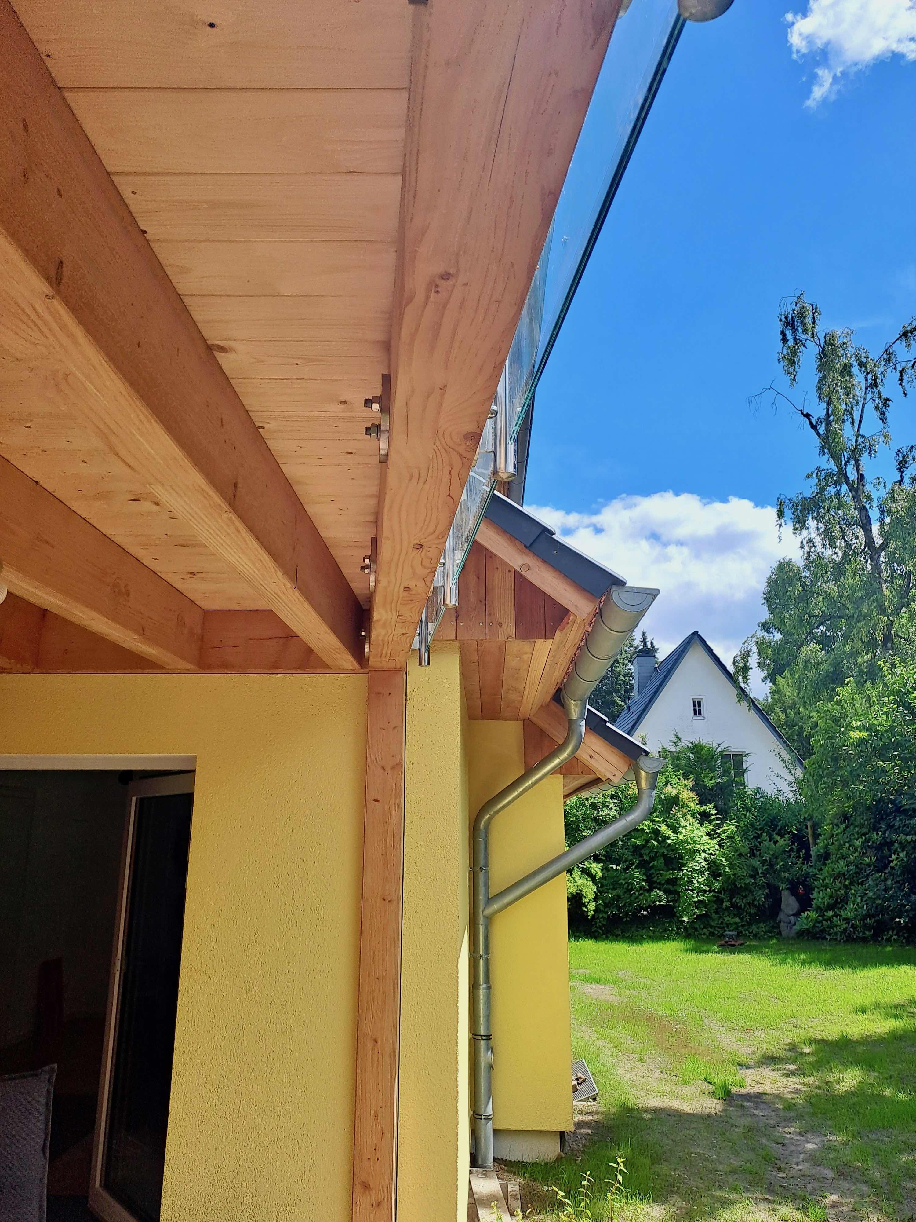 Balkon aus Lärchenholz mit Brüstungsgeländer aus Edelstahl und Glas
